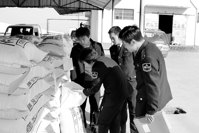根據(jù)《山東省企業(yè)產(chǎn)品標準備案管理辦法》的規(guī)定,山東鄒平縣質監(jiān)局于近日對本縣飼料企業(yè)標準進行審定,重點關注飼料添加劑的使用情況,明確不能使用三聚氰胺,確保產(chǎn)品質量安全。圖為工作人員深入飼料加工企業(yè)進行檢查。